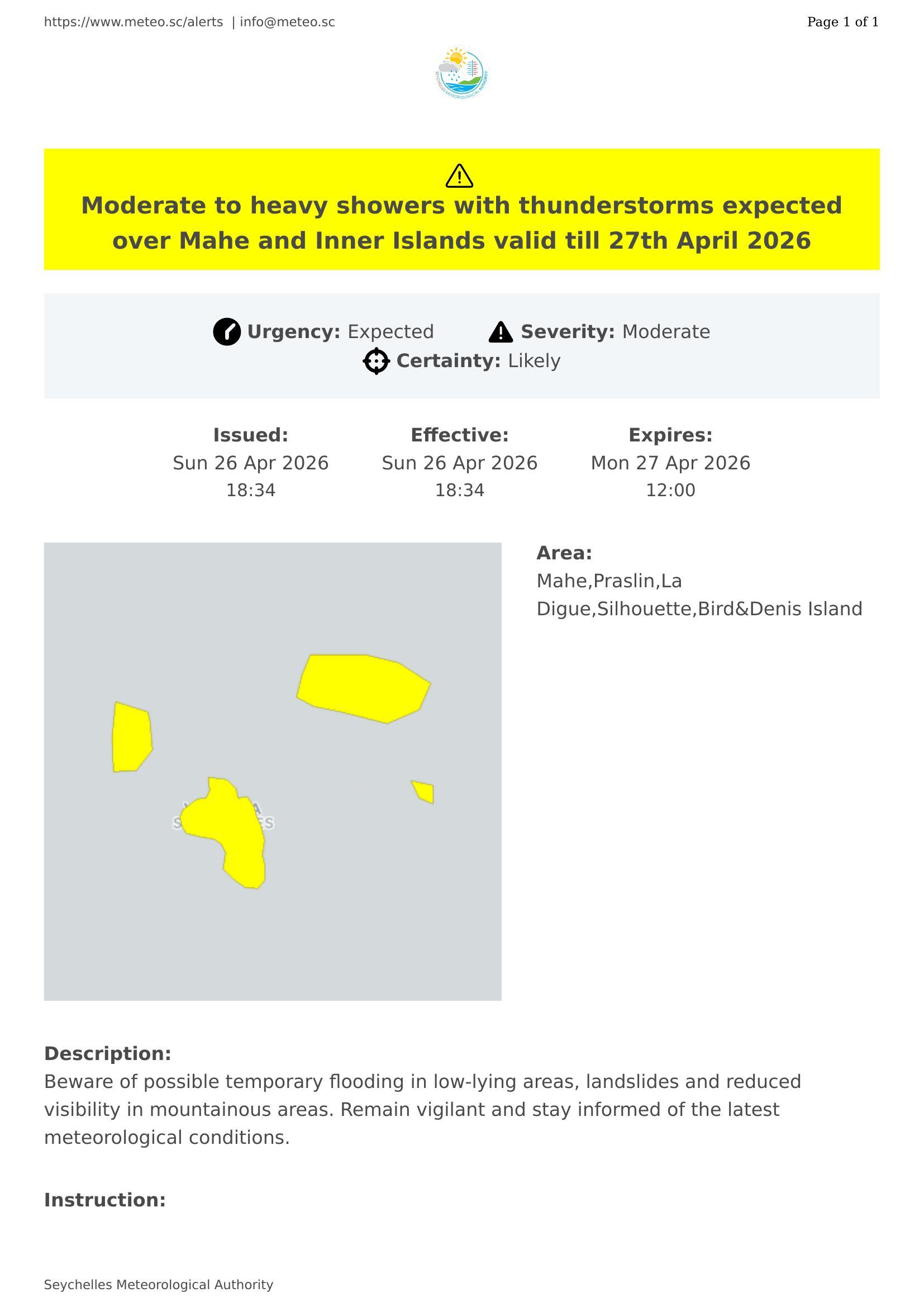 Moderate to heavy showers with thunderstorms expected over Mahe and Inner Islands valid till 27th April 2026