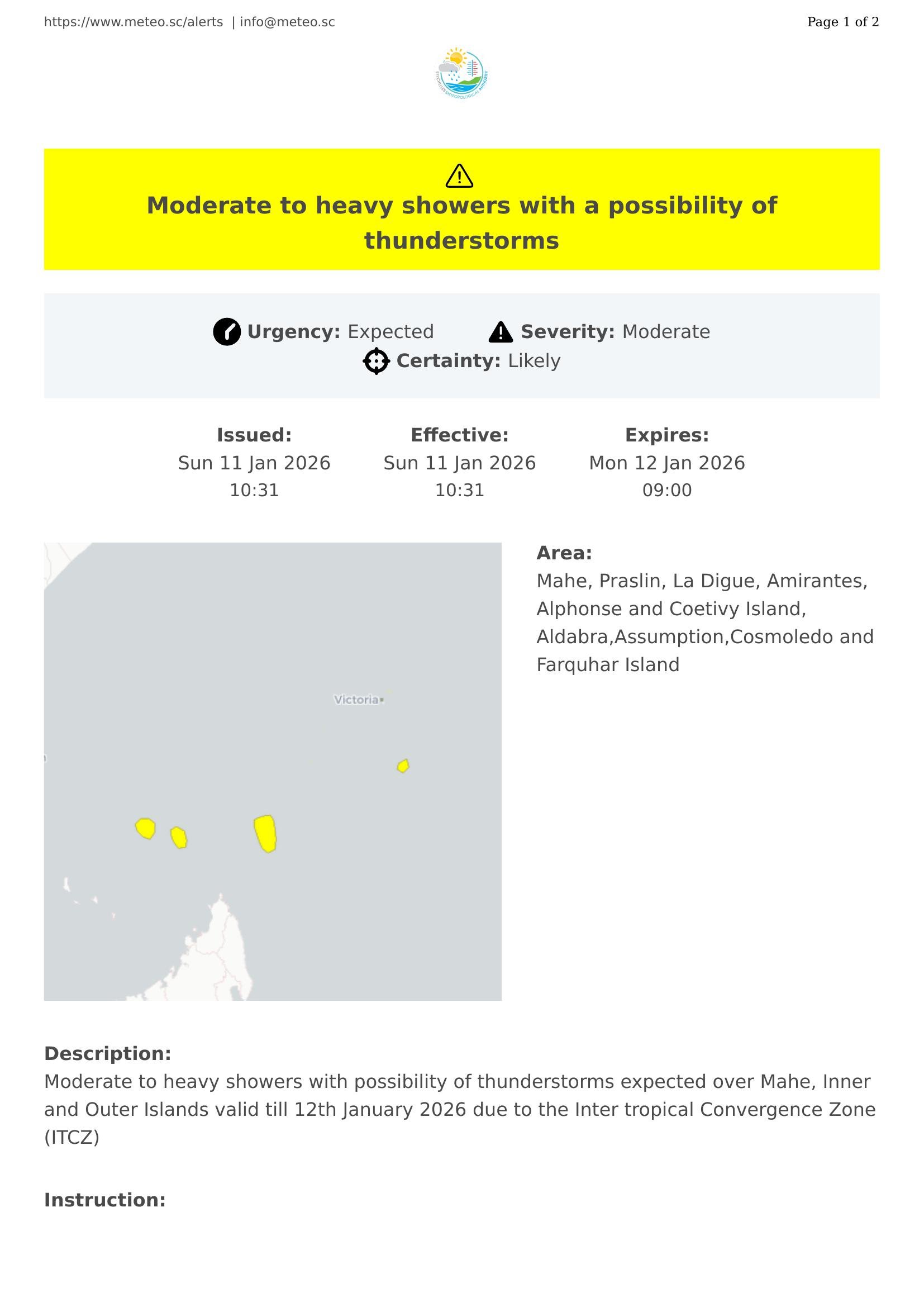 Moderate to heavy showers with possibility of thunderstorms expected over Mahe, Inner and Outer Islands valid till 12th January 2026.