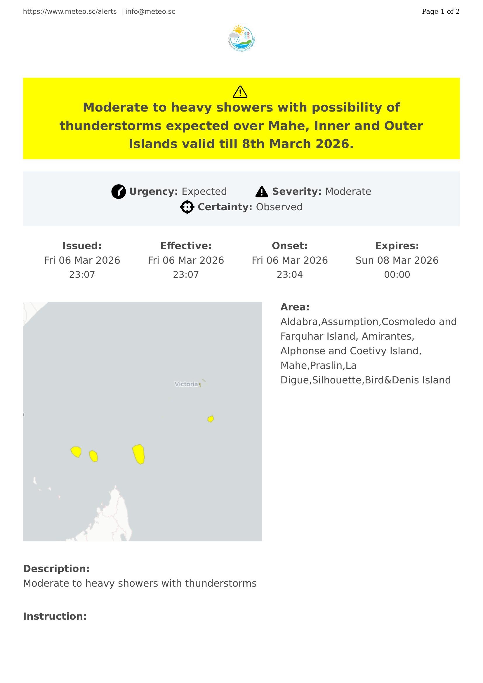 Moderate to heavy showers with possibility of thunderstorms expected over Mahe, Inner and Outer Islands valid till 8th March 2026.