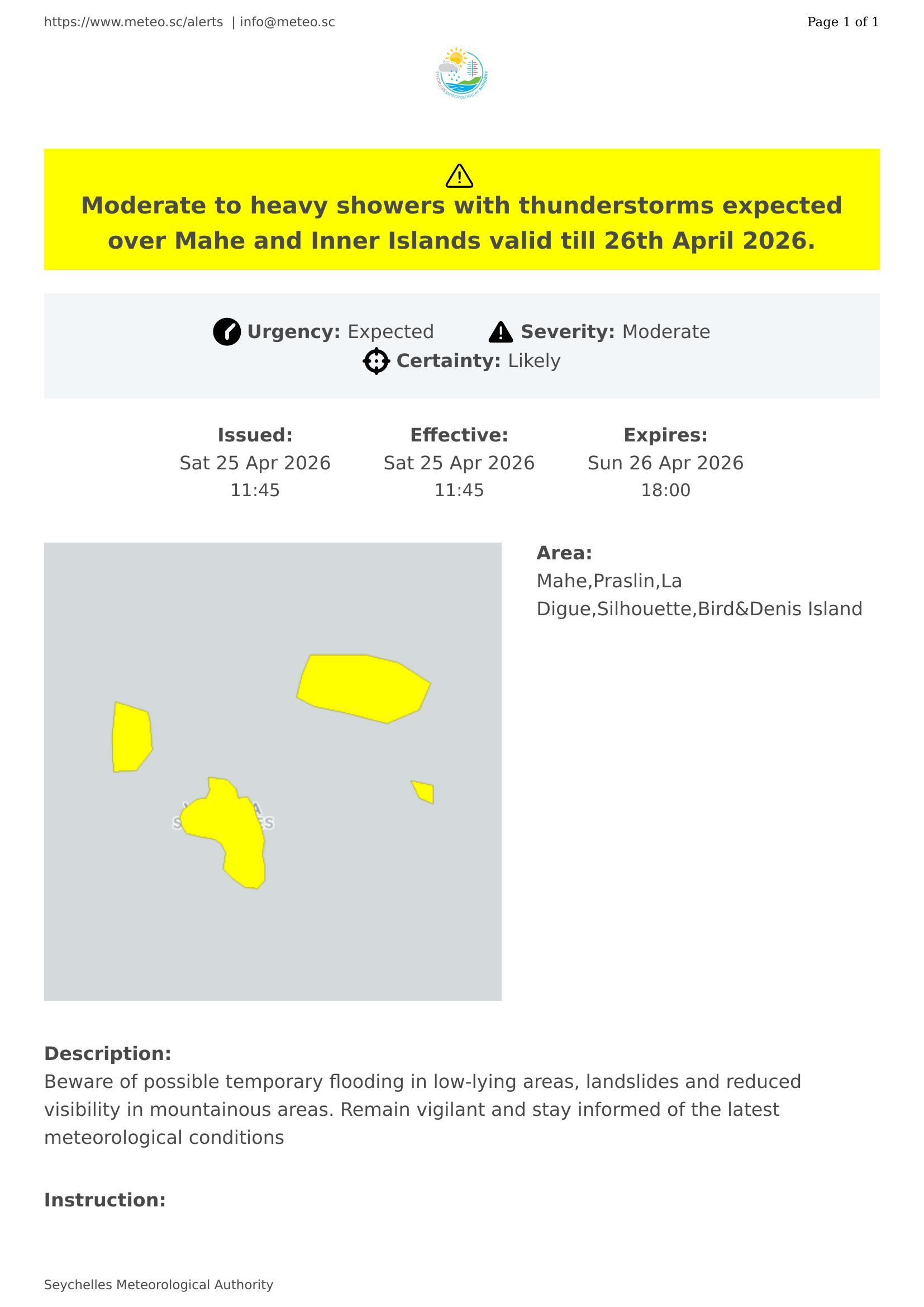 Moderate to heavy showers with thunderstorms expected over Mahe and Inner Islands valid till 26th April 2026.