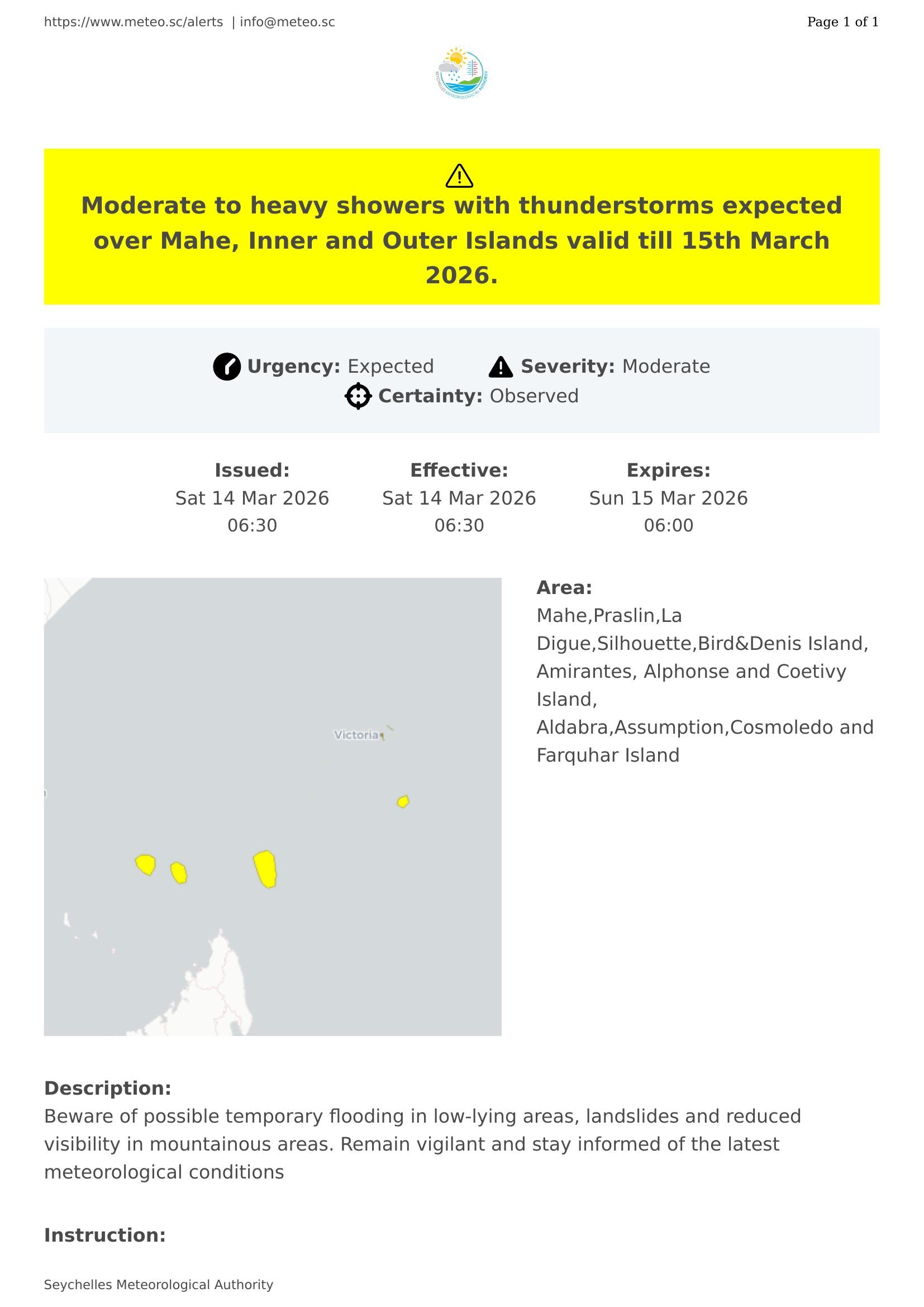 Moderate to heavy showers with thunderstorms expected over Mahe, Inner and Outer Islands valid till 15th March 2026.