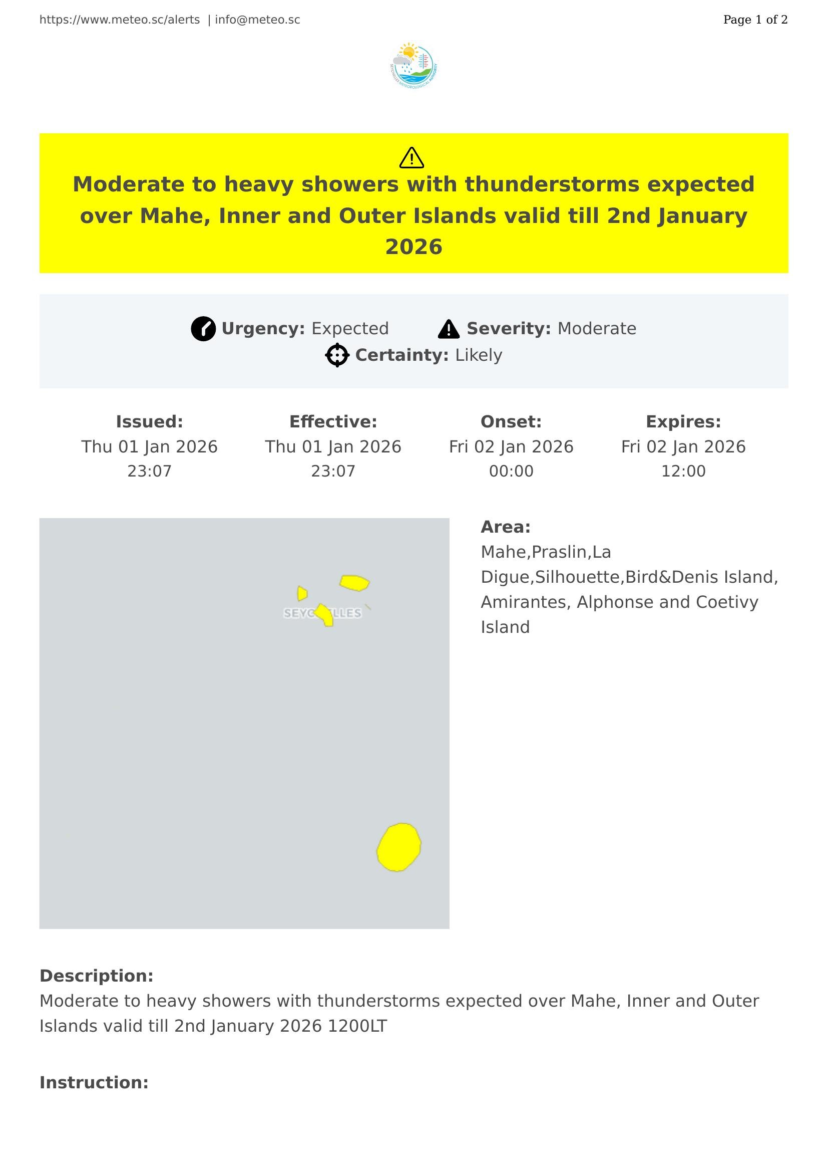 Moderate to heavy showers with thunderstorms expected over Mahe, Inner and Outer Islands valid till 2nd January 2026 1200LT