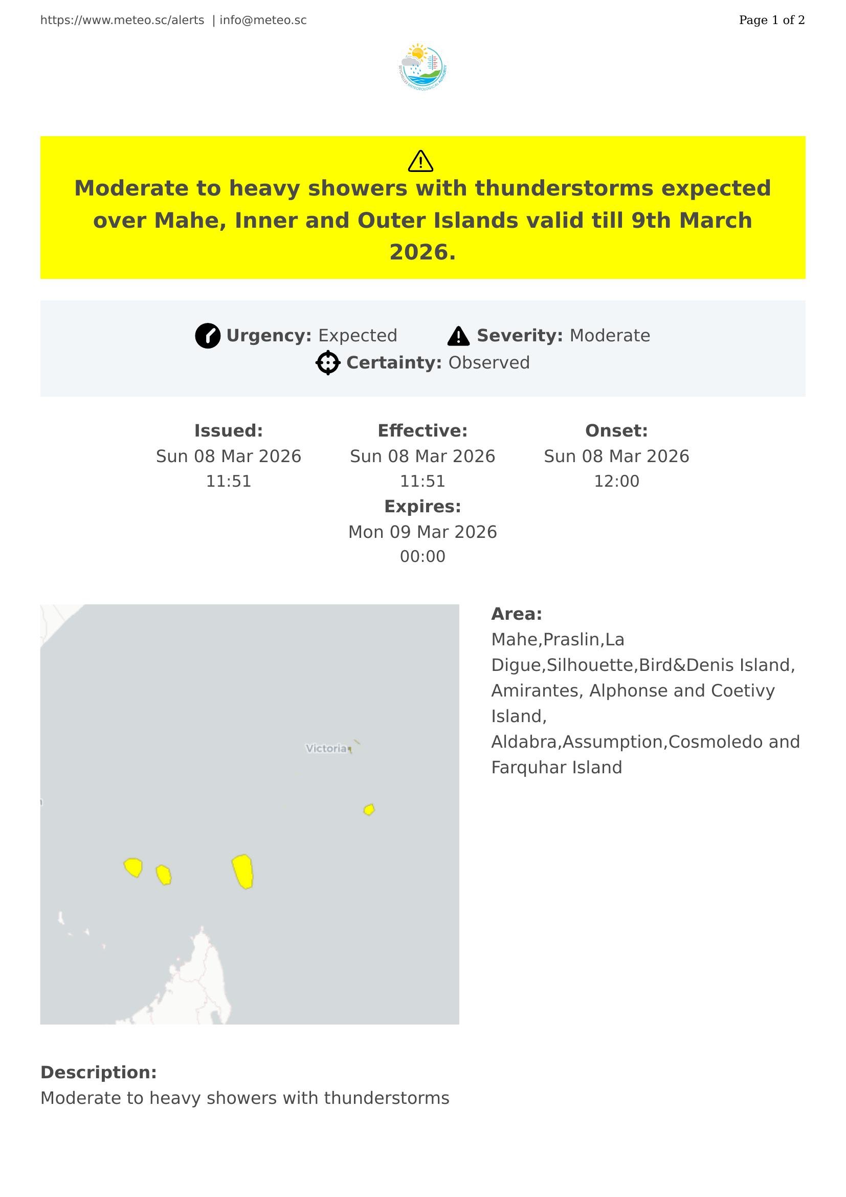 Moderate to heavy showers with thunderstorms expected over Mahe, Inner and Outer Islands valid till 9th March 2026.